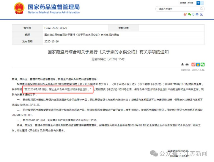 根据国家药监局综合司关于履行《关于汞的水俣公约》有关事项的通知,自2026年1月1日起,禁止生产含汞体温计和含汞血压计。